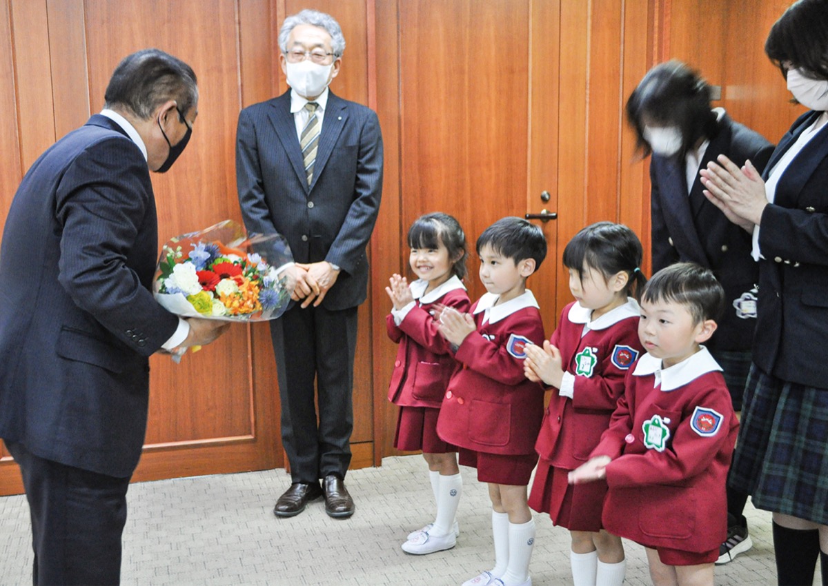 当日市役所を訪れた園児らは、本村賢太郎市長と対面し、「お釈迦様のお誕生日をお祝いしました」と声をそろえて報告。園児から花束と甘茶を受け取った本村市長は「お友達をたくさん作って、仲良く頑張って」と笑顔で応じ、市のマスコットキャラクター「さがみん」のシールとクレヨンを進呈した。