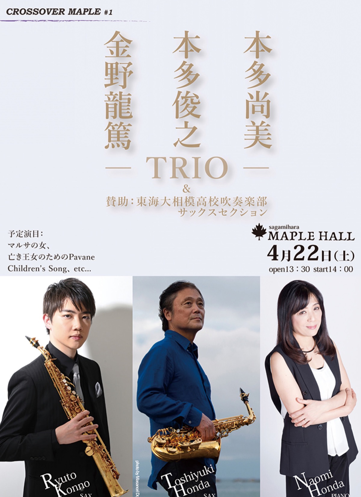 メイプルホール(千代田)で4月22日(土)、コンサート「金野龍篤 本多俊之 本多尚美-TRIO-」が開催される。