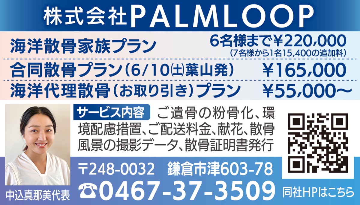 鎌倉市で海洋散骨事業を営む株式会社PALMLOOP(中込真那美代表)。相模湾や東京湾など神奈川県内各地で、遺骨を自然に還す新しい葬儀をプロデュースする。