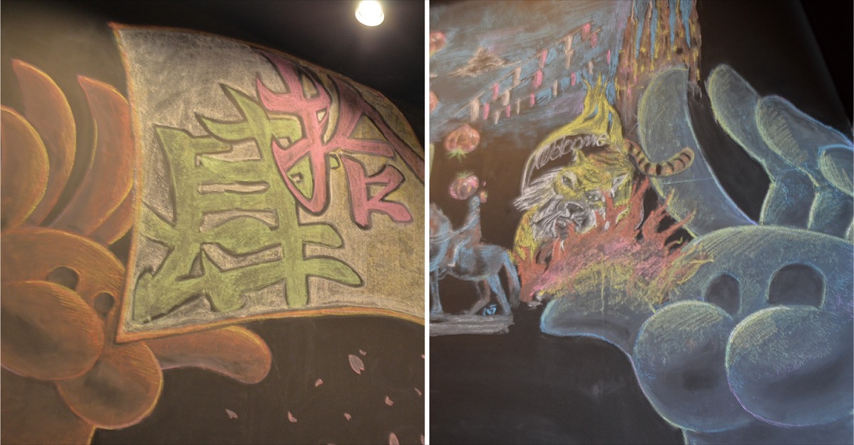 7人はデザインについてアイデアを出し合い、テーマを「祭り」と定めて担当を割り振った上で同店を訪問。三村さんの「『呼ぶ赤い手、青い手』(西門商店街にある岡本太郎によるオブジェ)を取り入れてほしい」といった要望も聞き入れ、制作にとりかかった。約半日で完成した作品には「相模の大凧」や「上溝夏祭り」、ヨーロッパ各国の祭りをイメージした風景、色とりどりの花などが描かれ、店内を華やかに彩っている。原さんは「お店で出しているのが西洋料理なので、ヨーロッパのモチーフを採用した。料理との相性や、店外からの見え方も意識して描いた」と説明する。室本さんは「まだまだ描き続けたかった。チョークは初めて使う画材だったので、もっと勉強したいと刺激にもなった」と感想を話した。
