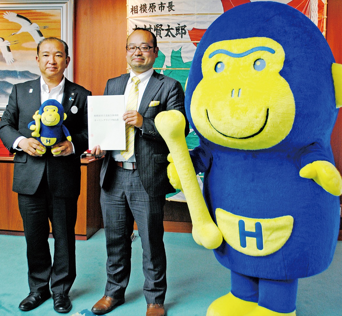 同社阿部公太郎社長らが市役所を訪れ、本村賢太郎市長らと面会した=写真。その中で阿部社長はネーミングライツスポンサーに名乗り出たことについて「会社が創立10年を迎えたタイミングで、お世話になった相模原への貢献を考えた」と説明。尊敬する経営者という渋沢栄一の「目先のことだけでなく、地域社会を考えることが大事」という教えが背中を押したと話した。
