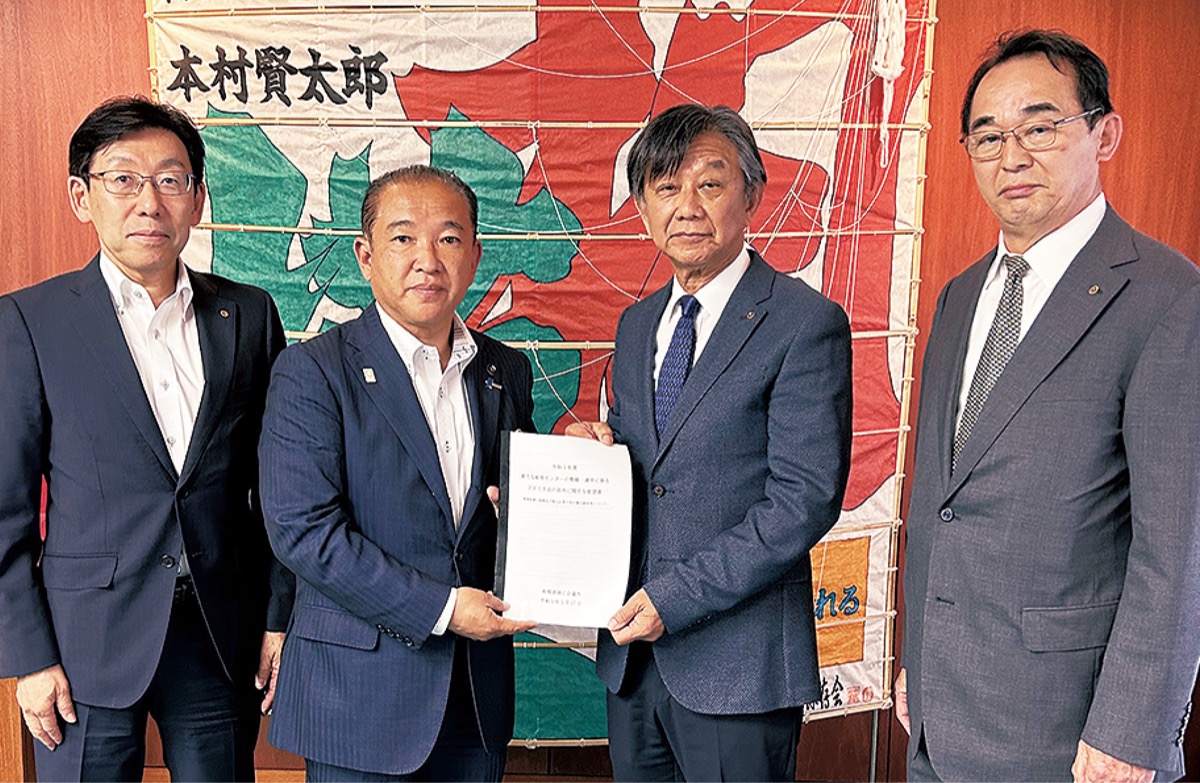 同商議所杉岡芳樹会頭をはじめ建設業部会長の谷津弘氏らが市役所を訪れ、本村賢太郎市長に要望書を手渡した。