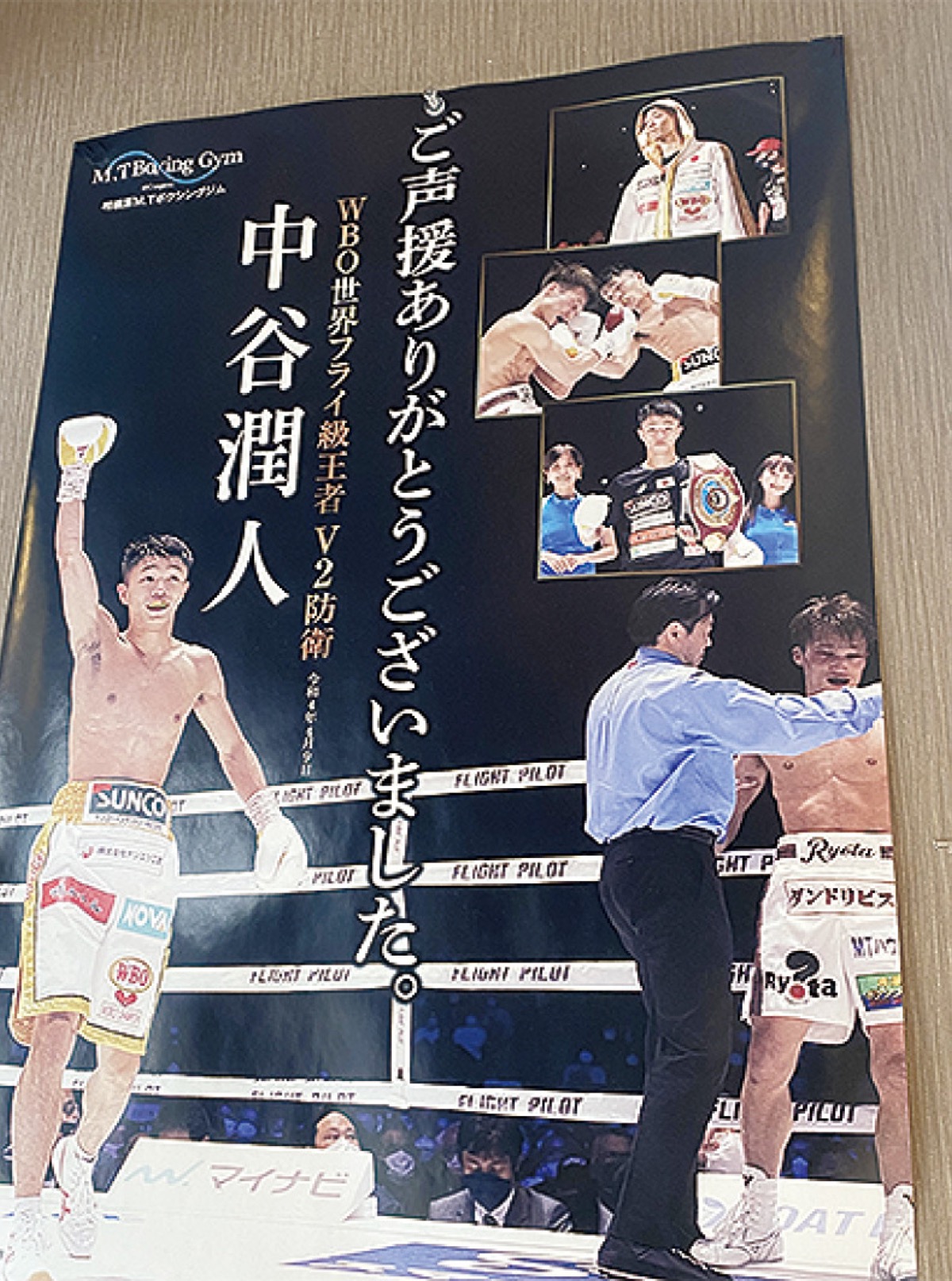 三上社長は中谷選手が所属するM・Tボクシングジム(緑区西橋本)の村野健会長と20年来の親交があり、4年ほど前から中谷選手のスポンサーを務めている。市内にある店舗に中谷選手のポスターを貼るなど、会社全体で応援している。