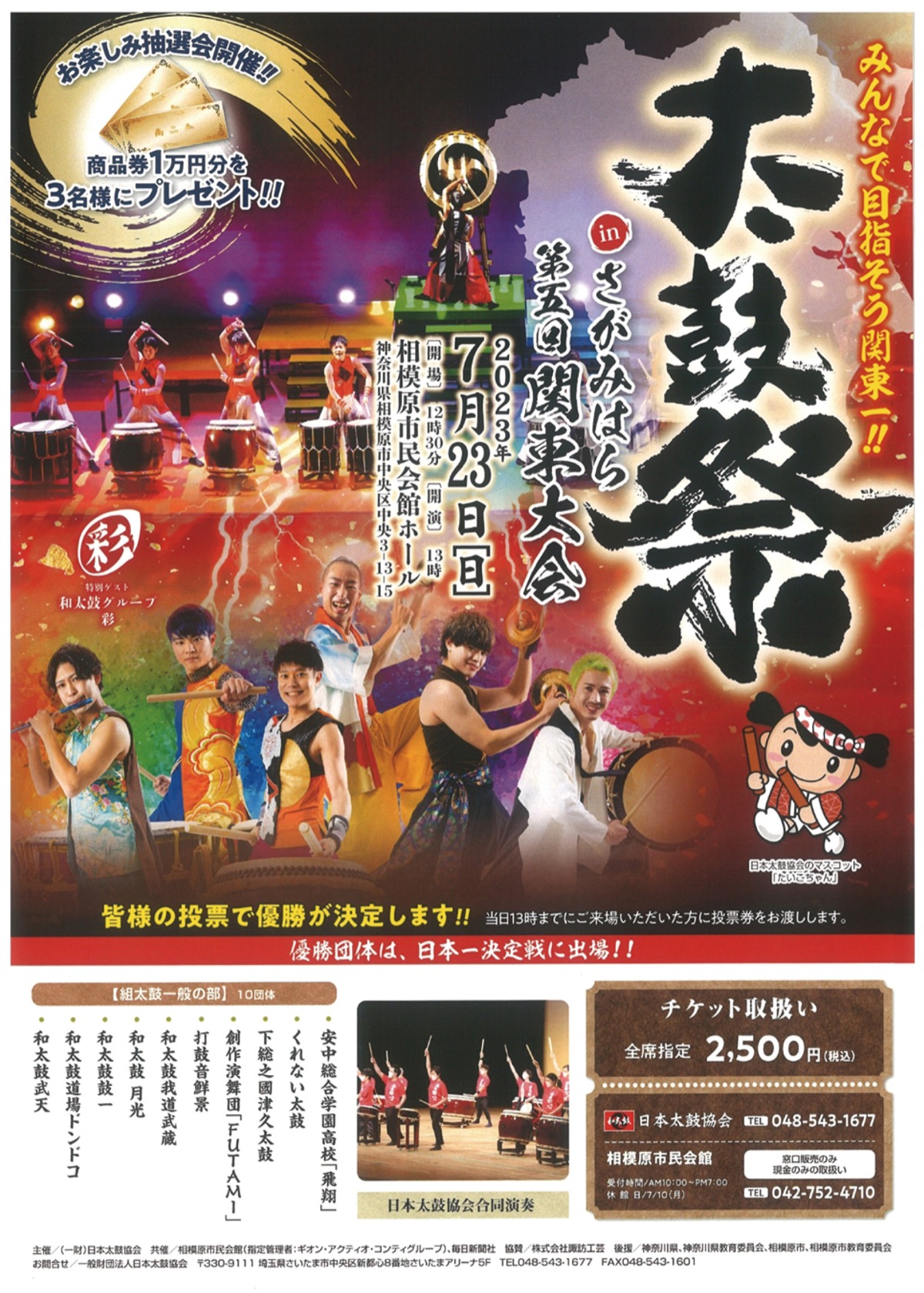 日本太鼓協会は7月23日(日)、「太鼓祭inさがみはら第5回関東大会」を相模原市民会館ホール(中央3の13の15)で開催する。午後0時30分開場、1時開演。チケットは全席指定2500円。