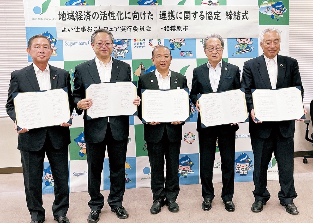 市内の信用金庫と相模原市が連携して地域活性化へ--。全国の信用金庫で運営している「よい仕事おこしフェア実行委員会」(事務局=城南信用金庫)が相模原市と「地域経済の活性化に向けた連携に関する協定書」を結んだ。市役所本庁舎で7月20日、締結式が行われた。