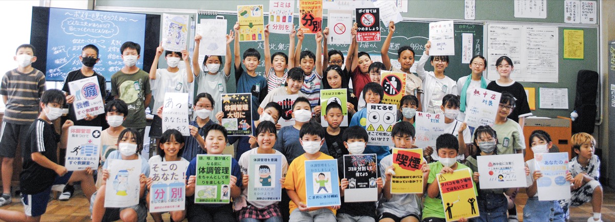 児童たちはまず「どんなポスターが目を引くのか」話し合い、それを踏まえて、支給されているタブレットPCや色鉛筆、ペンなどを用いて、趣向を凝らしたポスターを制作した。
