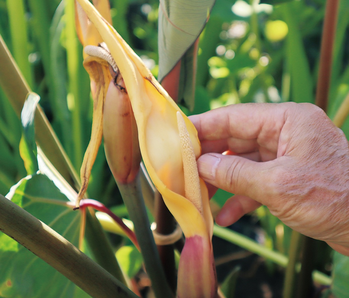 しかし亀崎さんと長澤さんが花を見るのは今年でなんと3年目。長澤さんが2年ほど前によりおいしいサトイモを食べようと、ホームセンターで購入した種芋が開花した。さらに次の年にも15株程花が咲いたという。長澤さんは「花が咲きやすい品種だったのかもしれない」と予想する。