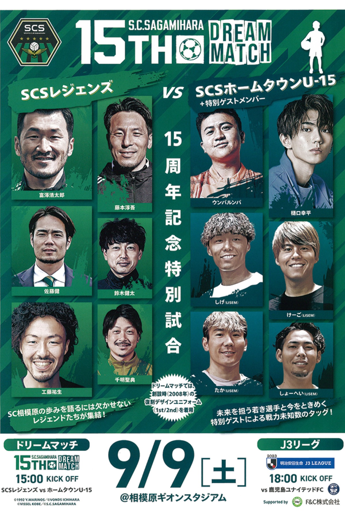 記念特別試合は「ドリームマッチ」とし、かつてチームに在籍した選手(SCSレジェンズ)とSCのホームタウンから選ばれた15歳以下の選手たち(SCSホームタウンU-15)が戦う。レジェンズは、富澤清太郎さん(2019-20)、藤本淳吾さん(20-22)、佐藤健さん(17-21)、鈴木健太さん(08-15)、工藤祐生さん(10-19)、千明聖典さん(17-20)ら。