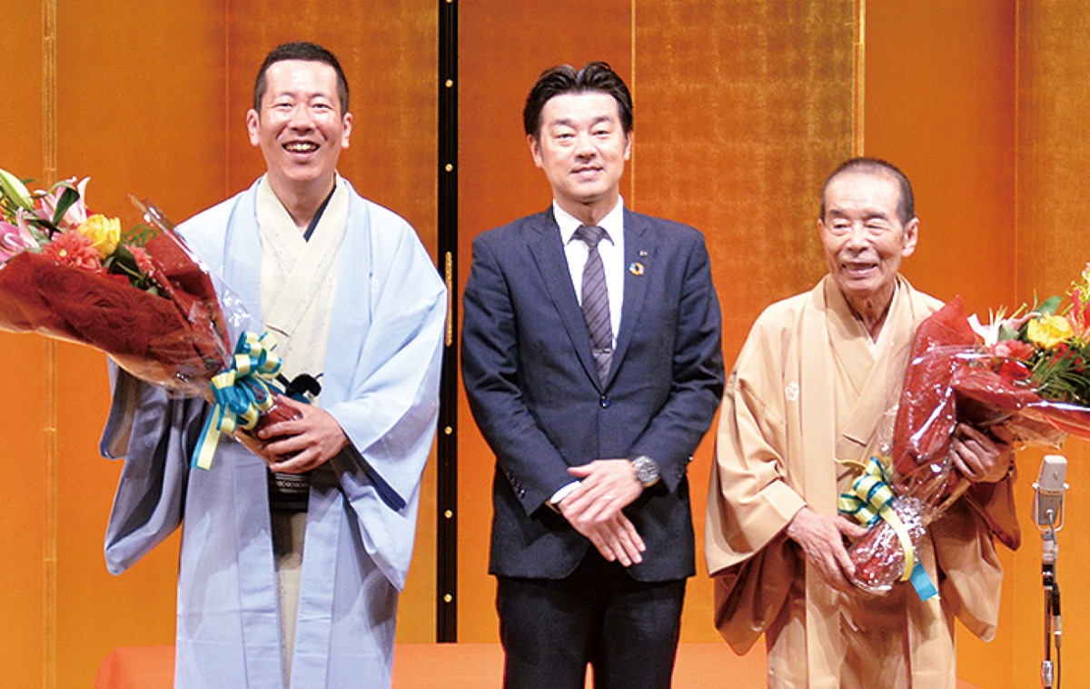 寄席の前には田中社長があいさつ。代表に就任してからの10年間を振り返り、「ここ数年は新型コロナウイルスの影響で葬儀のあり方がどんどん変わっていった。そこで創業の精神に立ち返り、お客様、社員、地域社会の三方よしを追求してきた」と話すと、新卒採用や働きがいの創出に尽力してきたことにも触れ、「2045年までに日本一のライフエンディンググループを作る。今後も皆さまのご支援を賜りながら成長、発展していきたい」と意欲を示した。