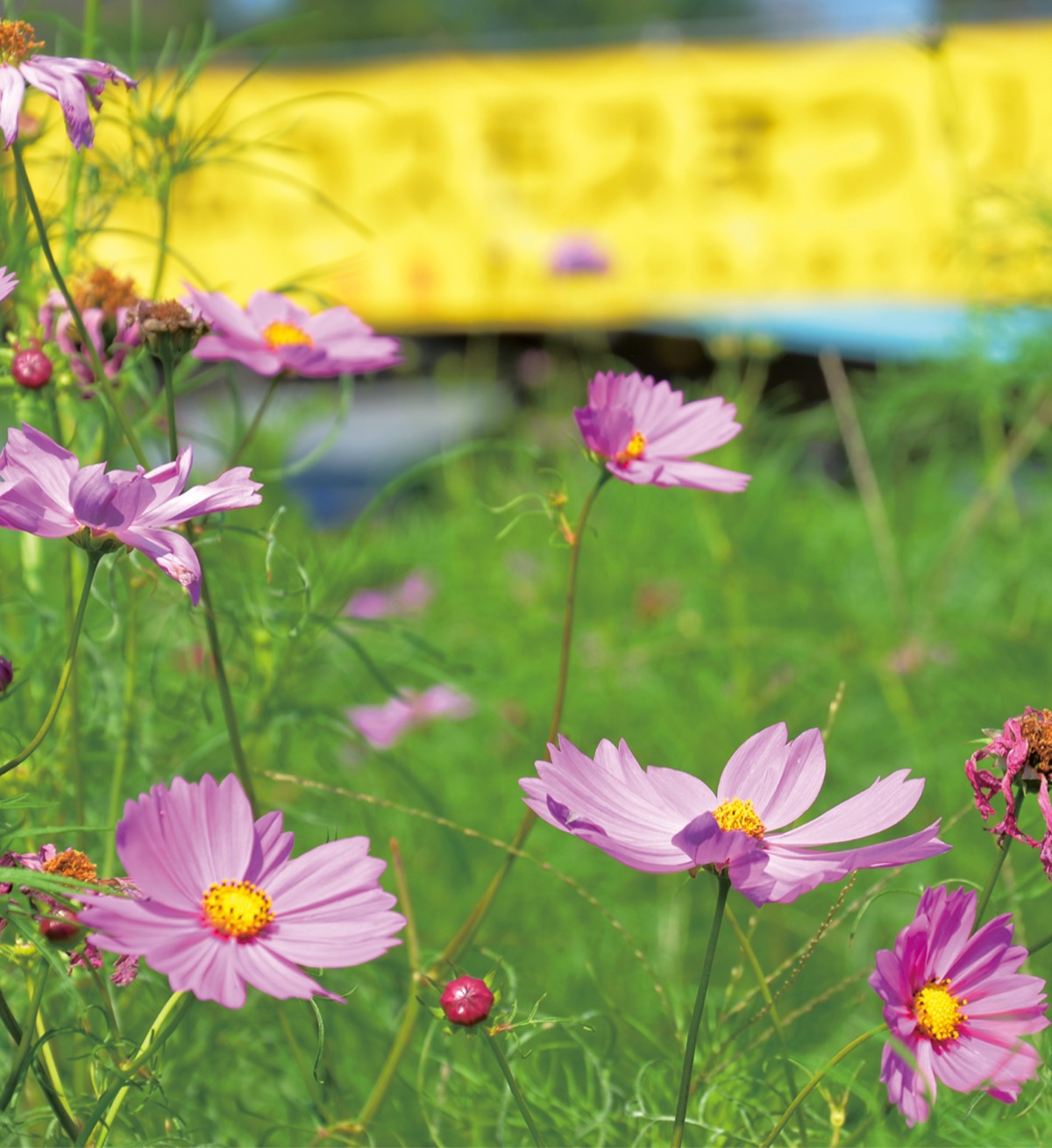 休耕農地を使い地域活性化のために植え始めたコスモス。7000平方メートルの畑に約50万本の花が咲き誇る。今年は猛暑の影響もあり雑草の成長が早く、実行委員会のメンバーが中心となり例年以上に草取りに手を焼いたと言う。「雑草は水分を持っていくから取っていかないとコスモスに影響がでてしまう」と会員。その成果もあり、今年は例年に比べ全体的に背が高めに育ったそう。