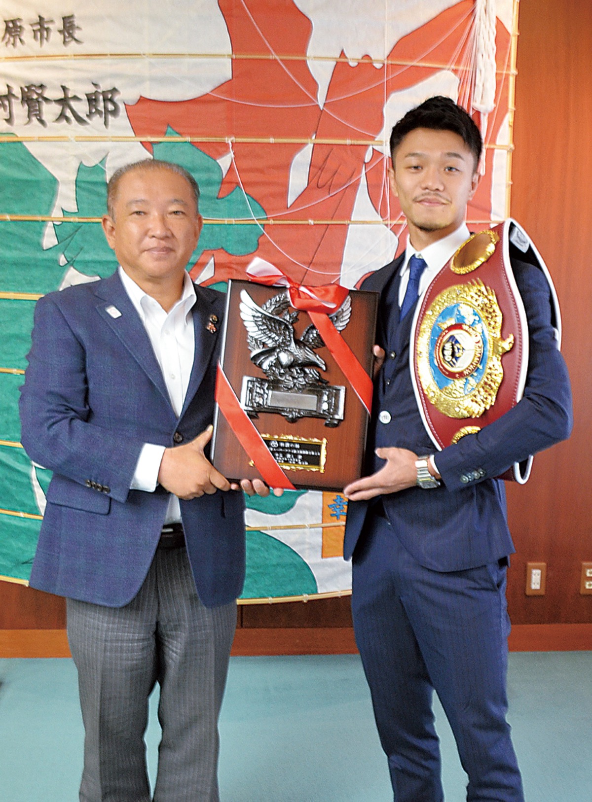 市内緑区在住で「WBO世界スーパーフライ級チャンピオン」の中谷潤人選手(M・Tボクシングジム)が10月6日、相模原市役所を訪れ、9月に行われたタイトルマッチに勝利し、王座初防衛に成功したことを本村賢太郎市長に報告した。