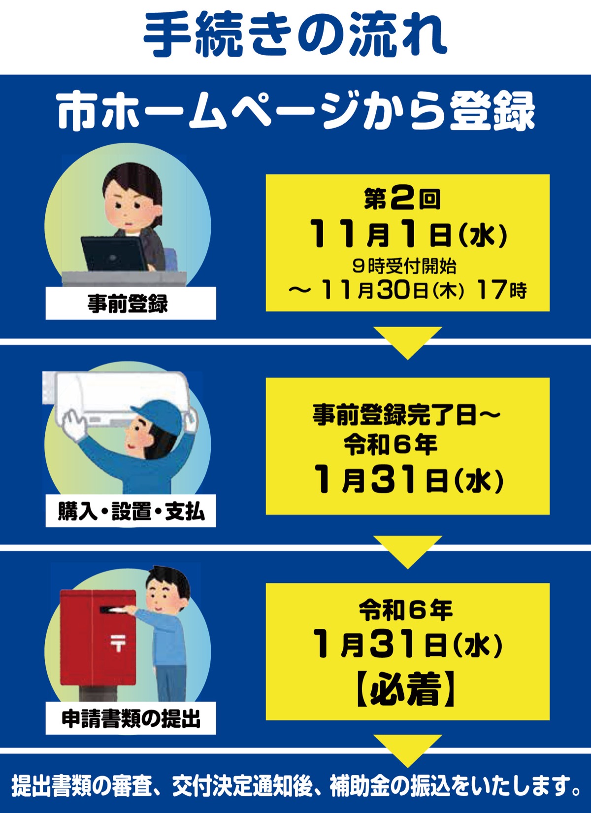 市ホームページからの事前登録は11月1日午前9時に受付開始(30日まで)。事前登録完了日から来年1月31日までに購入・設置・支払いを済ませること。申請書類の提出期限は来年1月31日(必着)ただし、先着順で予算の上限に達し次第、受付を終了する。第1回では事前登録締め切り日(8月31日)の1週間前に予算に達し、受付を終了した経緯がある。