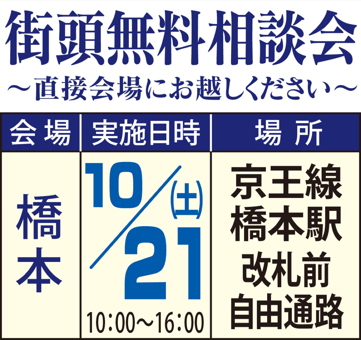 神奈川県行政書士会相模原支部(横山正直支部長)は、市民向け無料街頭相談会を10月21日(土)、京王線橋本駅改札前自由通路で開催する。午前10時〜午後4時。予約不要。希望者は支部HPを確認の上、直接会場へ。