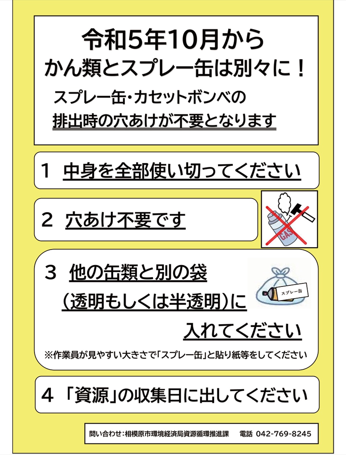 相模原市は10月から、スプレー缶・カセットボンベのごみ収集について分別方法を変更した。新しい分別方法では、スプレー缶・カセットボンベは資源の回収日に、中身を全部使い切った上で「穴を開けず」他の缶類と別の袋(透明もしくは半透明)に入れ、作業員が見やすい大きさで「スプレー缶」と貼り紙などをしてから、ごみ・資源集積場所に出す。