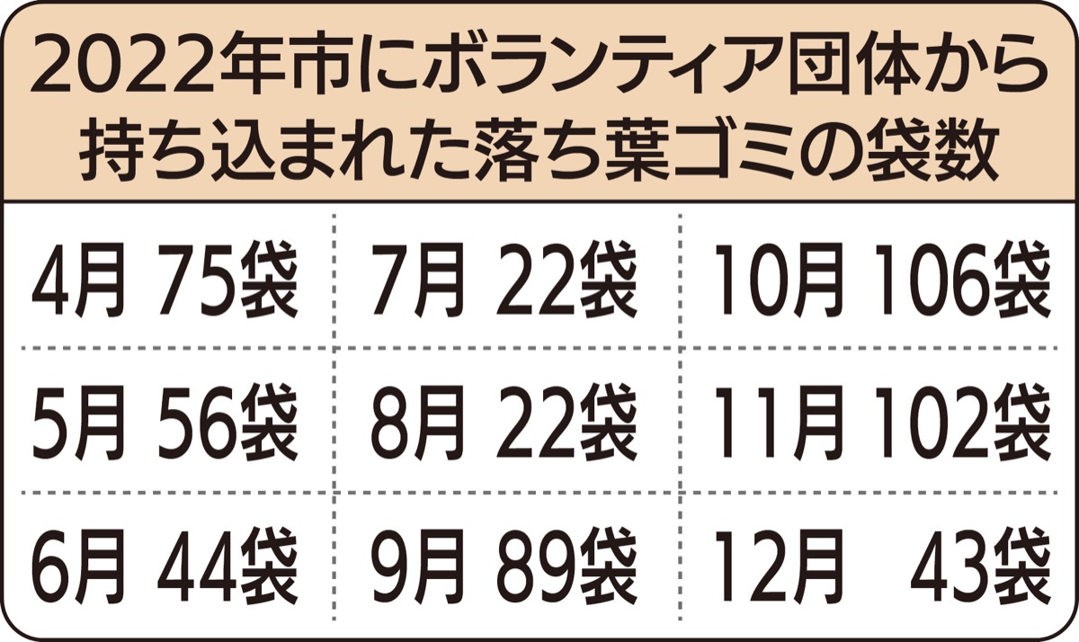 市中央土木事務所によると、ボランティア団体によって集められるゴミや落ち葉は10月と11月には月間100袋を超え、夏の5倍ほどの量になる。これらは市の焼却施設に運ばれ廃棄しているのが現状だ。
