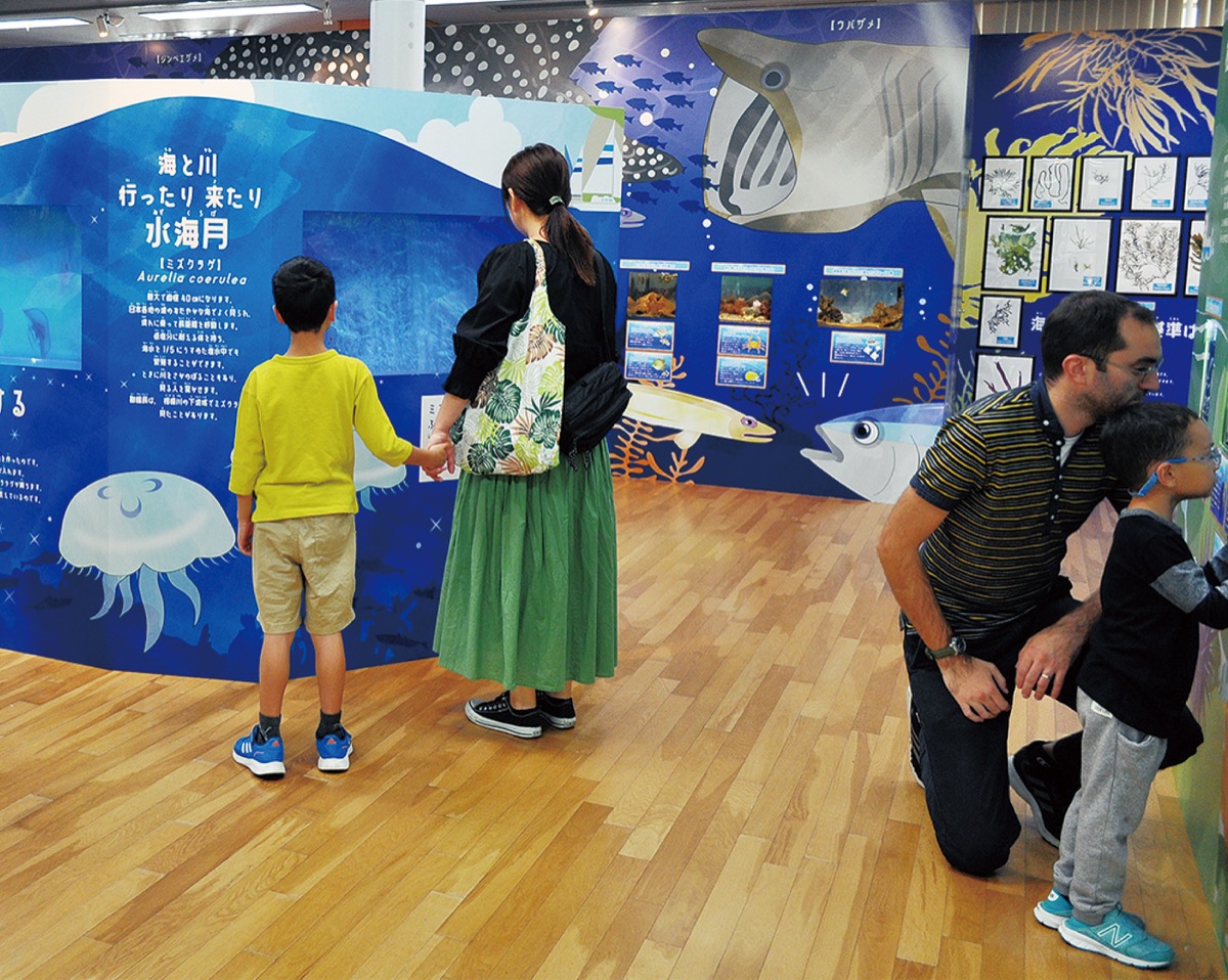 ふわふわと泳ぐミズクラゲや迫力満点のイセエビ、地上で最大のダンゴムシの仲間であるフナムシなど、70種400点を展示。巨大魚は稚魚の状態で展示するなど工夫を凝らし、相模湾の豊かさを紹介している。