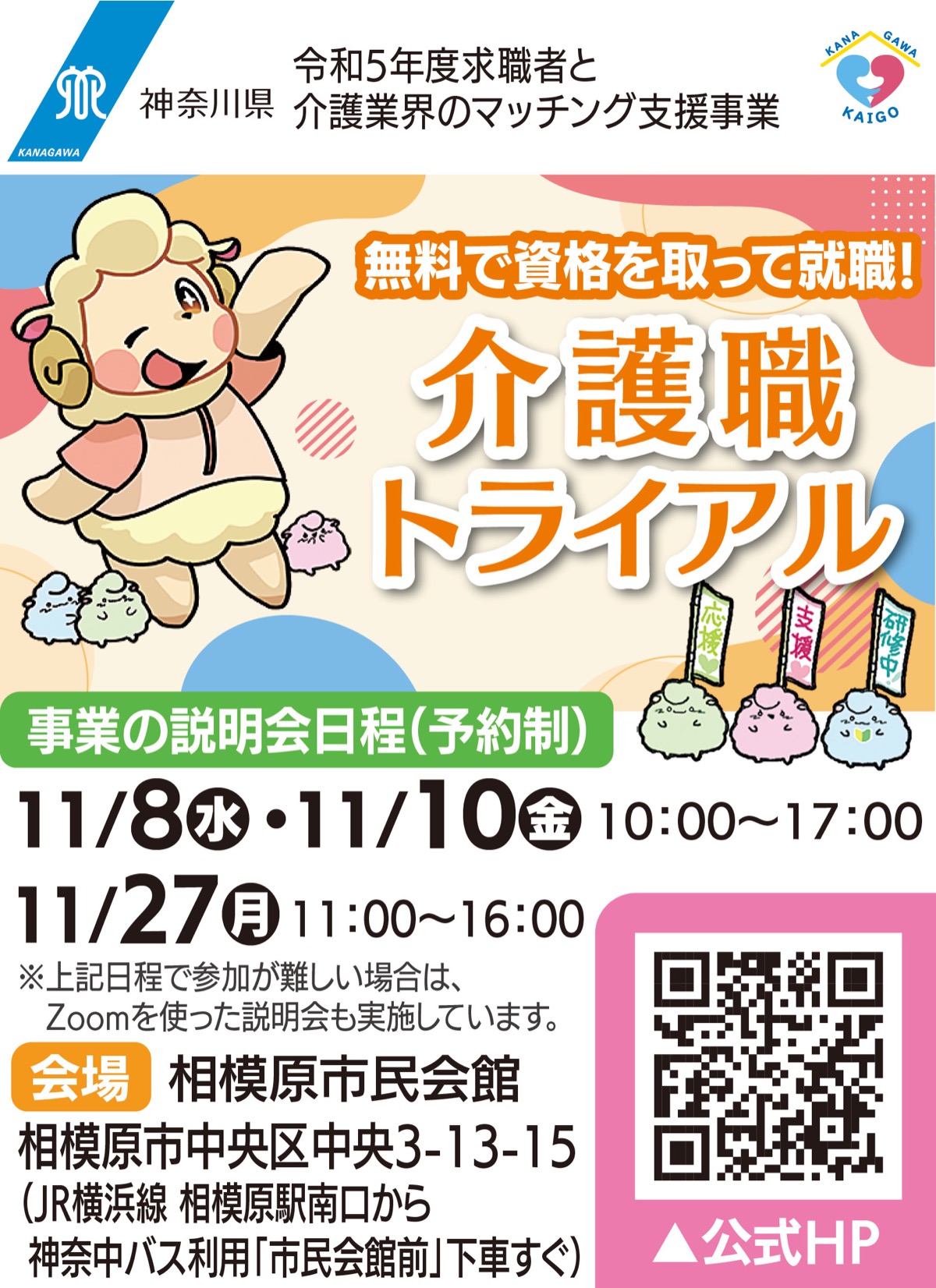神奈川県では、介護資格の取得から就職までをサポートする「介護職トライアル」を実施中。現在、事業説明会の参加者を募集している。