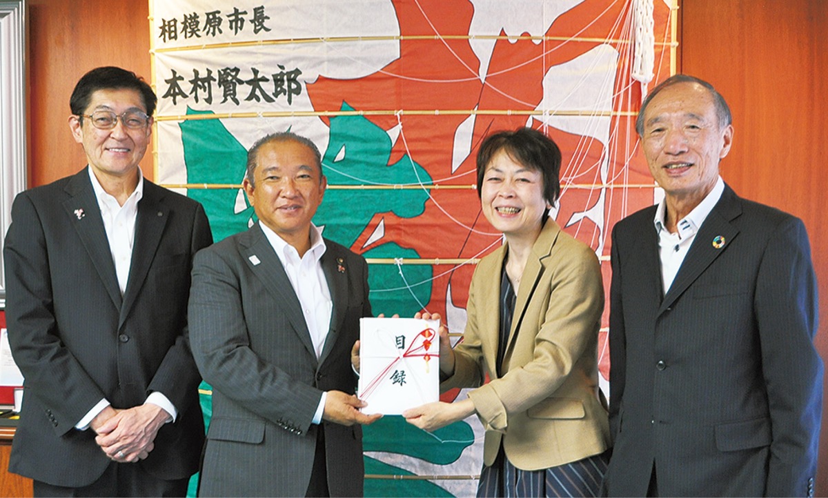 同連合会の熊谷会長と田中昌洋相談役から寄付金を受け取った本村市長は「地域のことを考え一生懸命活動してもらえるのはありがたい」と感謝を伝えた。熊谷会長は「コロナでお祭りができなかった。空白を取り返したい」と意気込みを話した。