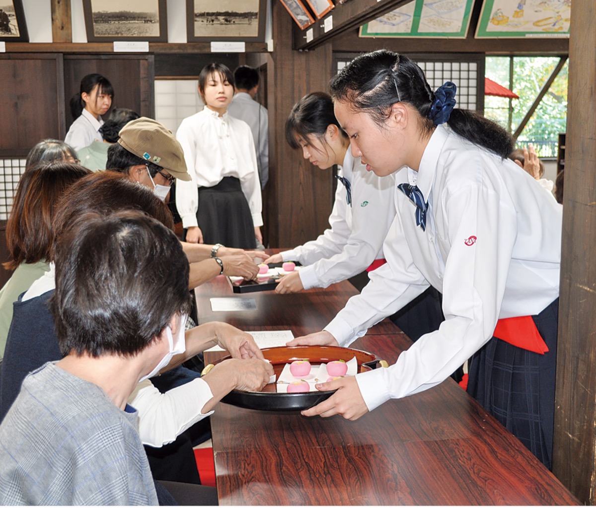 当日は集まった地域住民に向け、同部の生徒6人が茶と和菓子を振る舞った。生徒が作法について説明し、「お熱いのでお気をつけてお召し上がりください」と声をかけながら茶を配ると、参加者は談笑しながらお点前を実践していた。