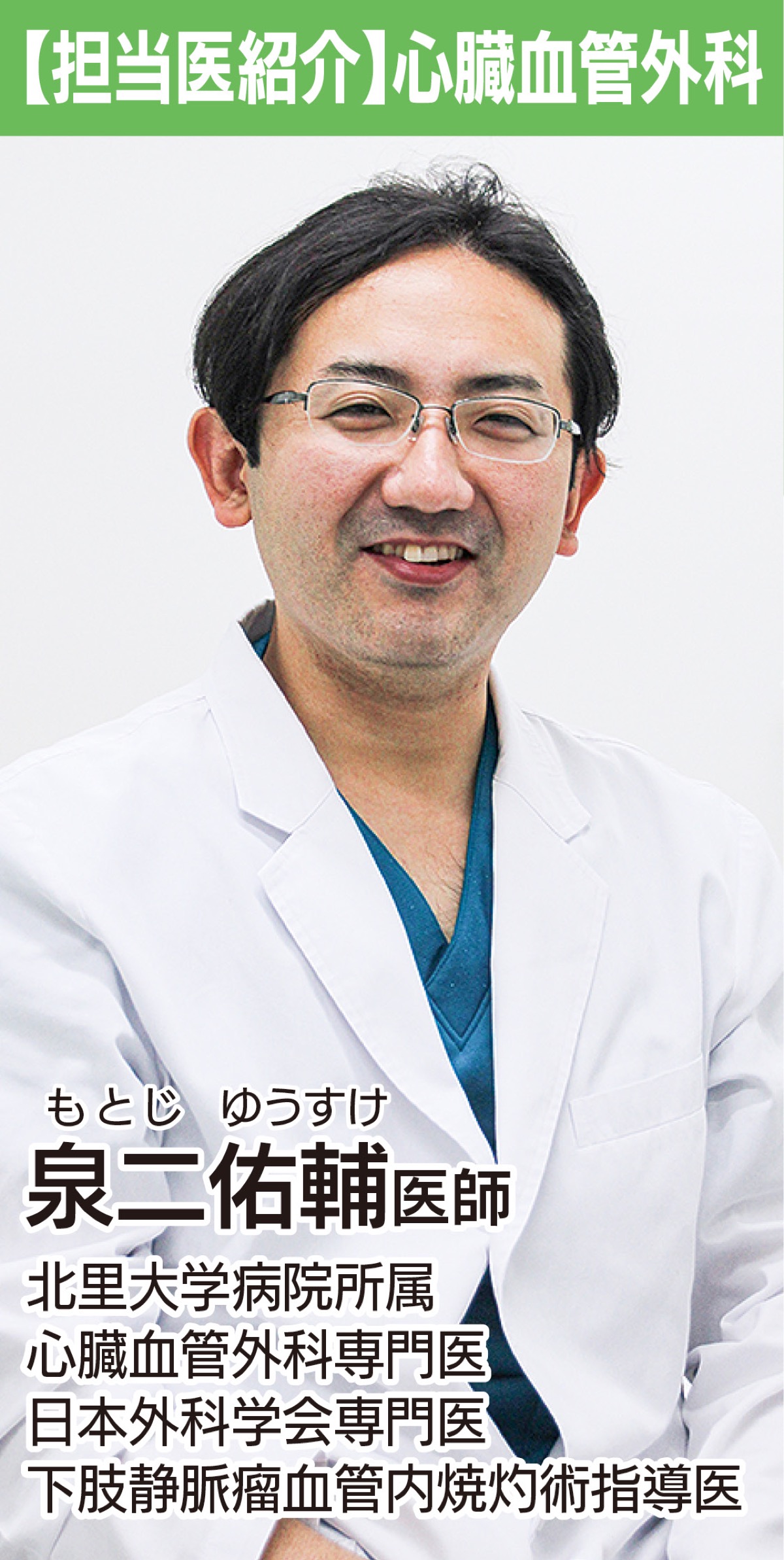 同院では先進的高周波治療装置(ラジオ波)による血管内焼灼術やストリッピング術、硬化療法など、さまざまな日帰り手術に保険診療で対応。診療日を週4日設け、美容師など立ち仕事の人の要望にも応える。「困ったら一度受診にお越しください」と話す泉二医師の診療は毎週火曜日の午前・午後と、第2・第4土曜日の午前・午後。予約優先。※インフルエンザ予防接種受付中
