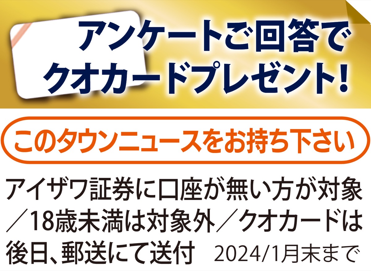 地域密着を打ち出すアイザワ証券・町田支店では現在、他証券からの移管にかかる手数料を負担してくれる。対象となるのは国内株式や投資信託、外国株式で、アイザワ証券に移管した場合、元の会社に支払った手数料を返金してくれるという。1回の移管につき、上限は30万円。アイザワ証券が取り扱う商品に限られる。「町田支店では現在、当社に証券口座の登録がない方がアンケートに回答いただくとクオカードをプレゼントする企画も行っている。こちらは来年1月末まで。お気軽にお立ち寄りいただければ」と話している。