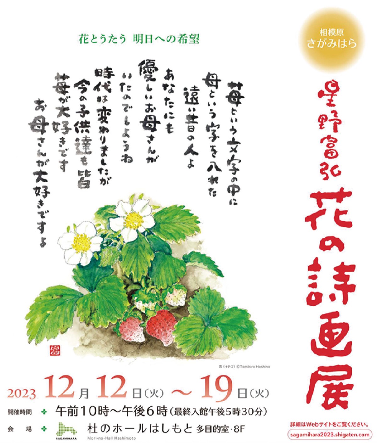 市内有志からなる「さがみはら星野富弘花の詩画展を開く会」(本間セツ会長)が主催する。身近な野の花に飾らない言葉を添える星野さんの作品は温かみに溢れ、市内にも多くのファンがいる。