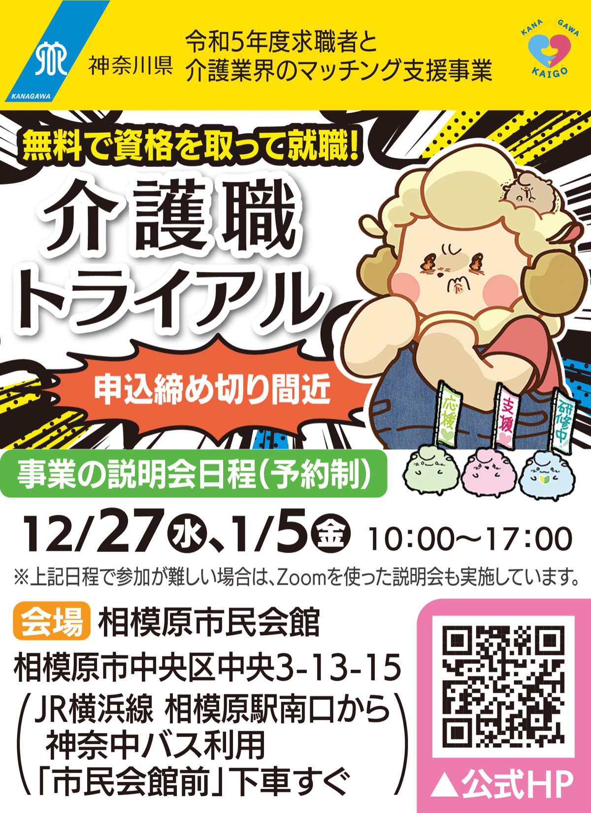 神奈川県では、介護資格の取得から就職までをサポートする「介護職トライアル」を実施中。現在、事業説明会の参加者を募集している。