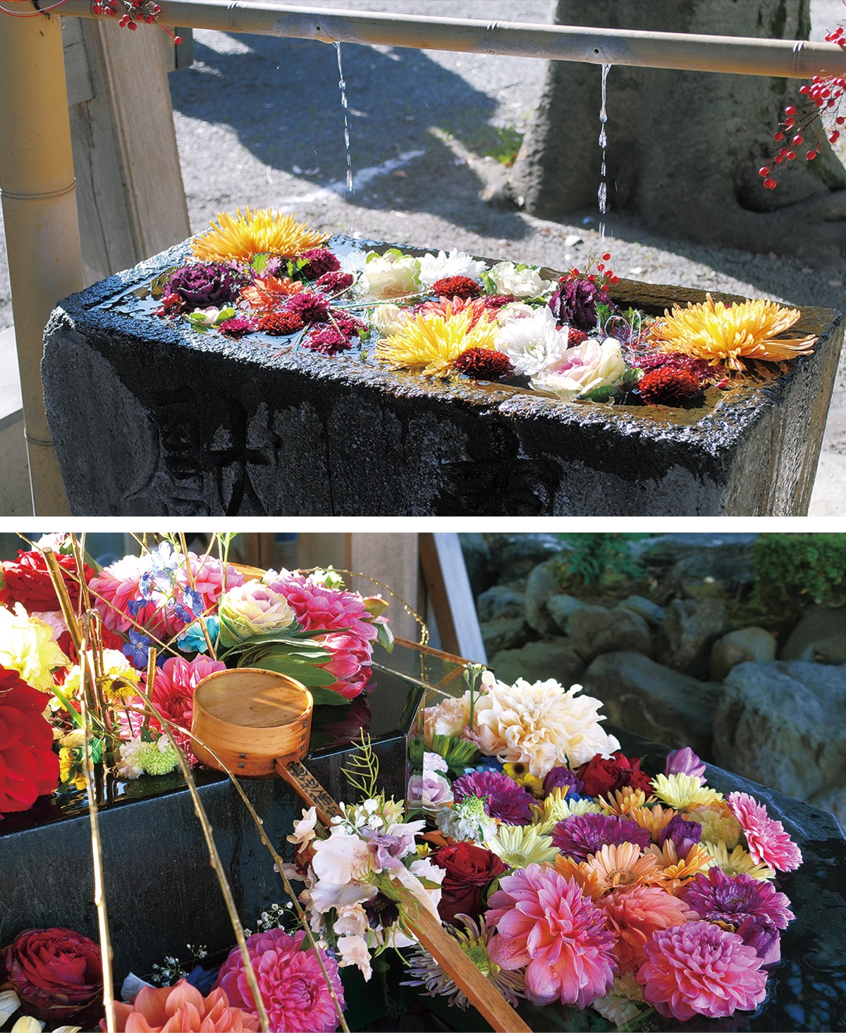 中央区の魅力づくり事業として季節ごとに実施されている「花手水」が区内4カ所で年末年始に開催され、訪れる人々の目を楽しませた。