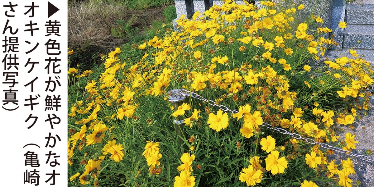 オオキンケイギクは鮮やかな黄色い花を咲かせるキク科の多年草。北米が産地で日本では1880年代から園芸用として販売、植栽されてきた。キバナコスモスに似ているが、花びらの先端がギザギザしていて葉はヘラのような形をしているのが特徴。コスモスは秋に花を咲かせるが、オオキンケイギクは5月〜7月に咲かせる。