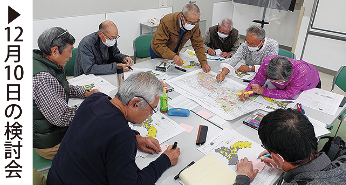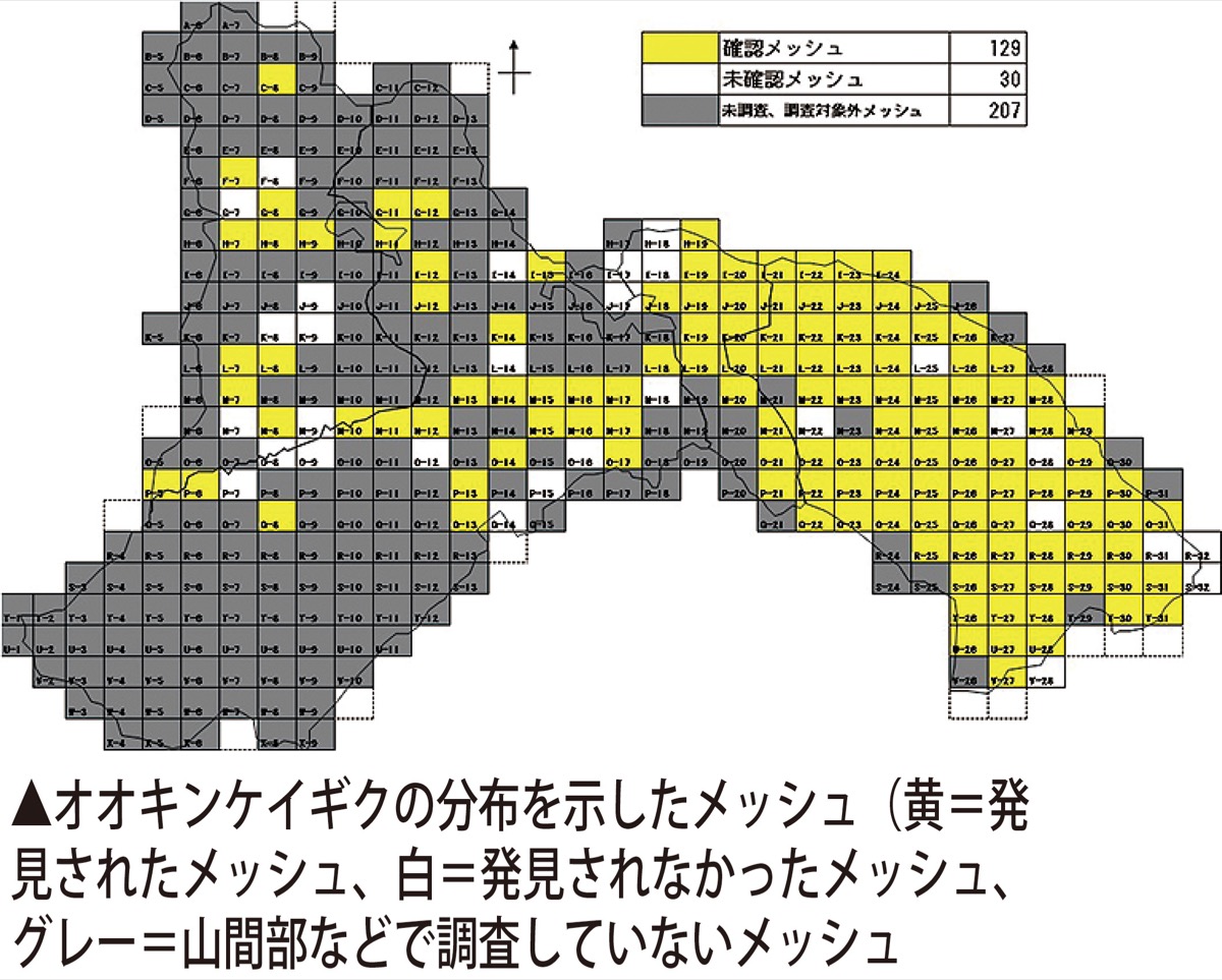 2023年度のテーマに掲げた「オオキンケイギクの分布調査」は4月16日から7月31日にかけて実施。市域を約1キロメートル四方のメッシュに区切り、徒歩や自転車を中心に道端や公園などを見て回った。山間地などで調査が困難なエリアを除いた188メッシュのうち、65人から159メッシュ分の結果を得ることができた。