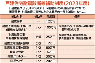 また市では耐震補助制度により住宅の耐震化を支援している。木造住宅を対象とした無料の窓口簡易耐震診断では、職員や耐震相談員とともに自宅に点数をつけて評価する。耐震診断士が自宅を訪問し、現地調査をする有料の「現地耐震診断」を受ける場合には最大12万円を補助。さらに、耐震改修計画書を作成し工事を行う際には、上限100万円を補助する(合計費用の2分の1以内)。高齢者世帯などには上限25万円の加算がある。
