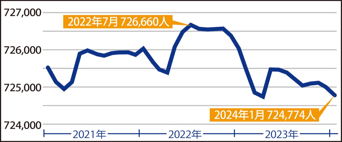 市が昨年公表した20年の国勢調査に基づく将来人口推計では、相模原市の人口のピークは25年で72万8千人に達すると見込まれていたが、市が毎月発表している国勢調査を基に算出する推計人口は22年7月の72万6660人をピークに減少傾向がみられる。昨年2月に72万6千人を割り込み、昨年12月には72万5千人を割り込んだ。今年1月1日時点で72万4774人となり、同課の担当者は「推計よりも早めに山を迎えている可能性もある」との見解を示す。