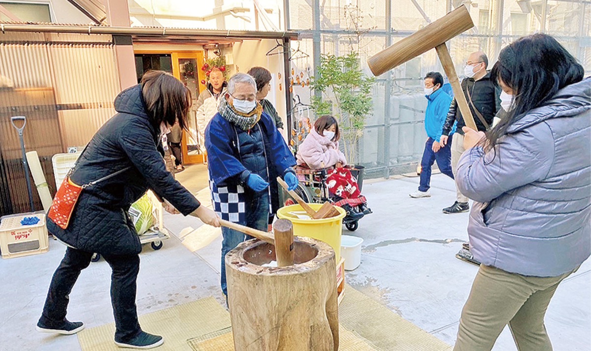 就労継続支援B型事業所「和が家・和が家カフェ」(中央/守屋みか子代表)で、昨年12月27日・28日、餅つき大会が行われた。
