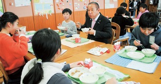 児童は訪れた本村市長を大きな歓声と拍手で迎え、会話を楽しみながら給食を頬張った。