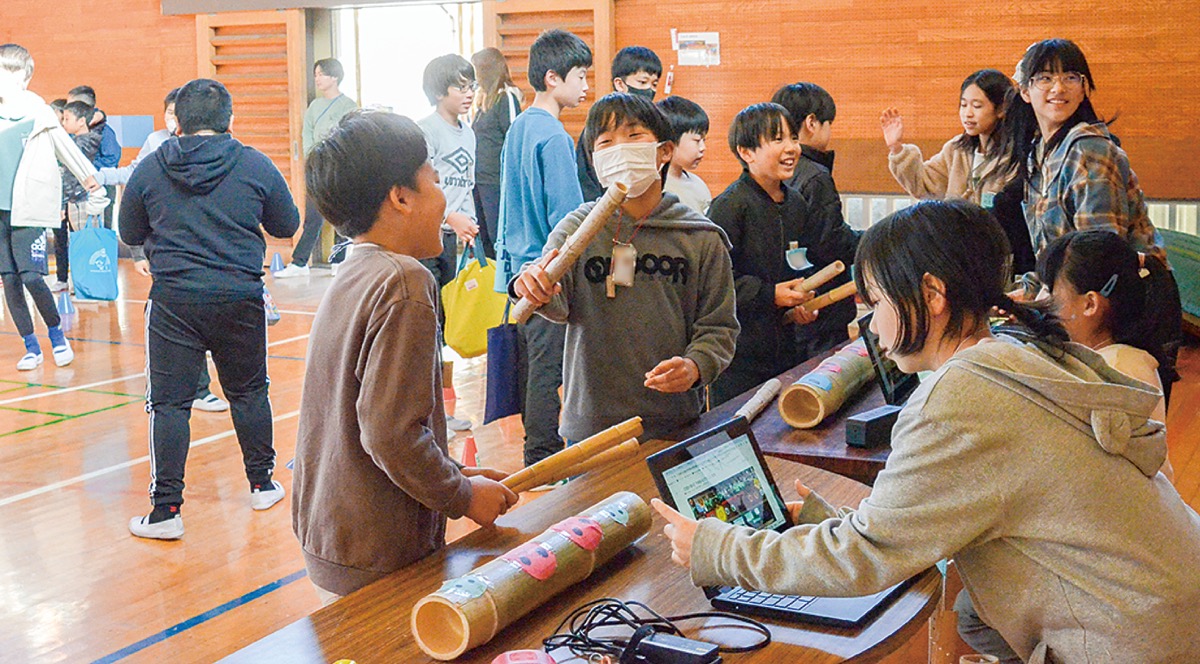 中央小学校(富士見)の5年生が2月8日、1年間学習してきた「竹」の魅力を伝えようと「竹まつり」を開いた。他学年の児童や富士見小学校の児童、学習に協力した関係者らが訪れ、竹を使った遊びや動画などを通して竹について楽しく学んだ。