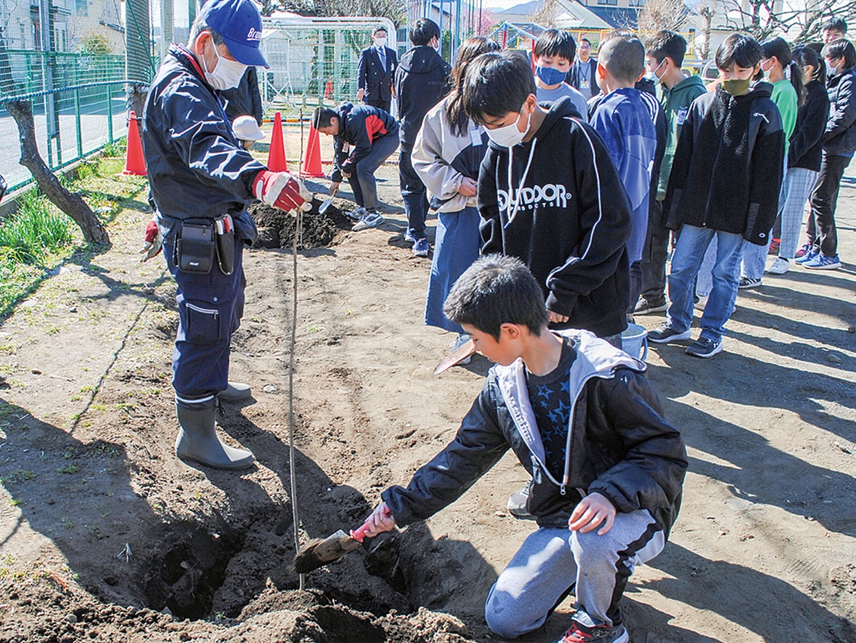 式では代表の児童が「桜の木を植えさせてもらえることを光栄に思います。感謝の気持ちを込めましょう」とあいさつ。協力のため訪れた「さがみはら桜守の会」の会員が、植樹する品種「舞姫」の特徴などについて説明した。苗木は、桜の普及を目的とする市民団体「相模原市さくらさくプロジェクト推進協議会」が提供した。