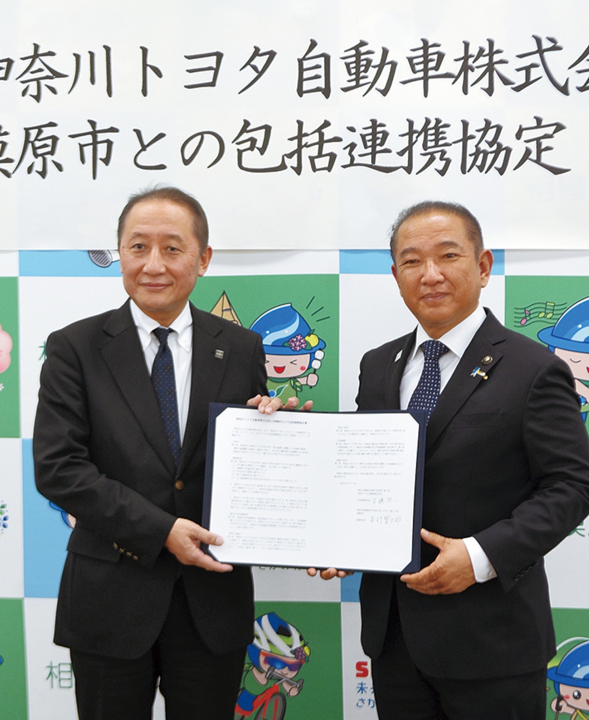 トヨタ車の販売店を展開する神奈川トヨタ自動車株式会社(横浜市)はこのほど、相模原市と包括連携協定を結んだ。2月14日、安藤栄一社長らが市役所を訪れ、本村賢太郎市長と締結式を行った。同社はこれまで個別案件で地方自治体との協定を結んできた実績はあるが、「包括」は初めて。今回の協定では両者が相互連携と協働による活動を推し進め、地域課題の解決に努めることを大きな目的としている。