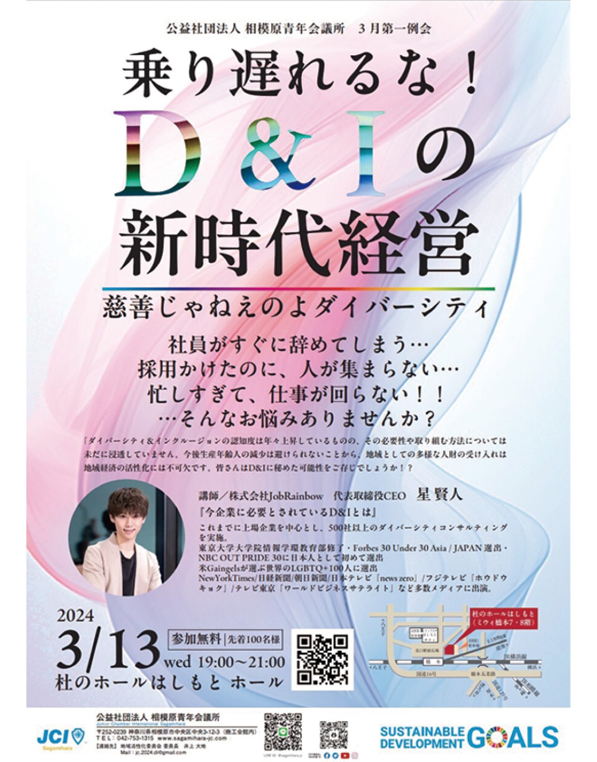 相模原青年会議所(JC)が3月13日(水)、経営者・企業関係者向けの講演会「乗り遅れるな!D&Iの新時代経営〜慈善じゃねぇのよ ダイバーシティ〜」を杜のホールはしもと(ミウィ橋本7・8階)ホールで開催する。講師はダイバーシティ経営に詳しい株式会社JobRainbow代表取締役CEOの星賢人氏。午後6時30分受付開始、午後7時開演。参加無料。定員100人。