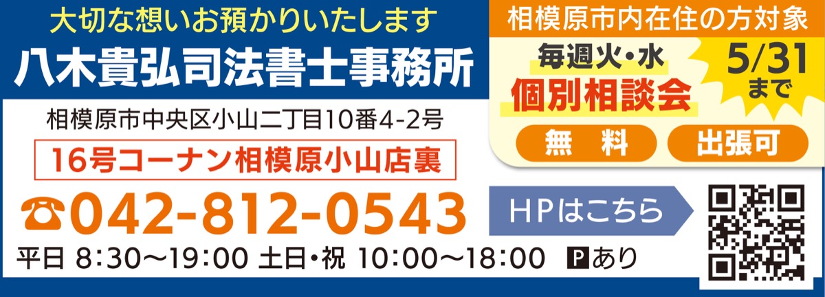 同事務所では5月31日までの毎週火・水曜日、相模原市内在住の人を対象に個別相談会を実施する。無料・要予約。出張相談も可。八木代表は「ひとりひとりに寄り添い、最後まで責任を持って対応します。ひとりで悩まず、まずはお気軽にご相談ください」と呼びかける。遺言、成年後見、家族信託なども相談可能。