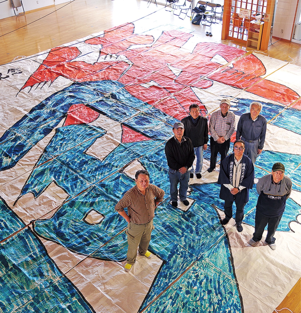 「題字を書き終えるといよいよだと感じるね」と話すのは、下磯部大凧保存会の会長を務める荒井慎一さん。同会の役員たちは3月30日、相模の大凧センター(新戸)で題字を書き終えた和紙の最終確認を行った。同会が揚げる大凧のサイズは6間(10・9m四方)。縦約1・4m、横約5・5mに張り合わせた和紙を16枚作る。