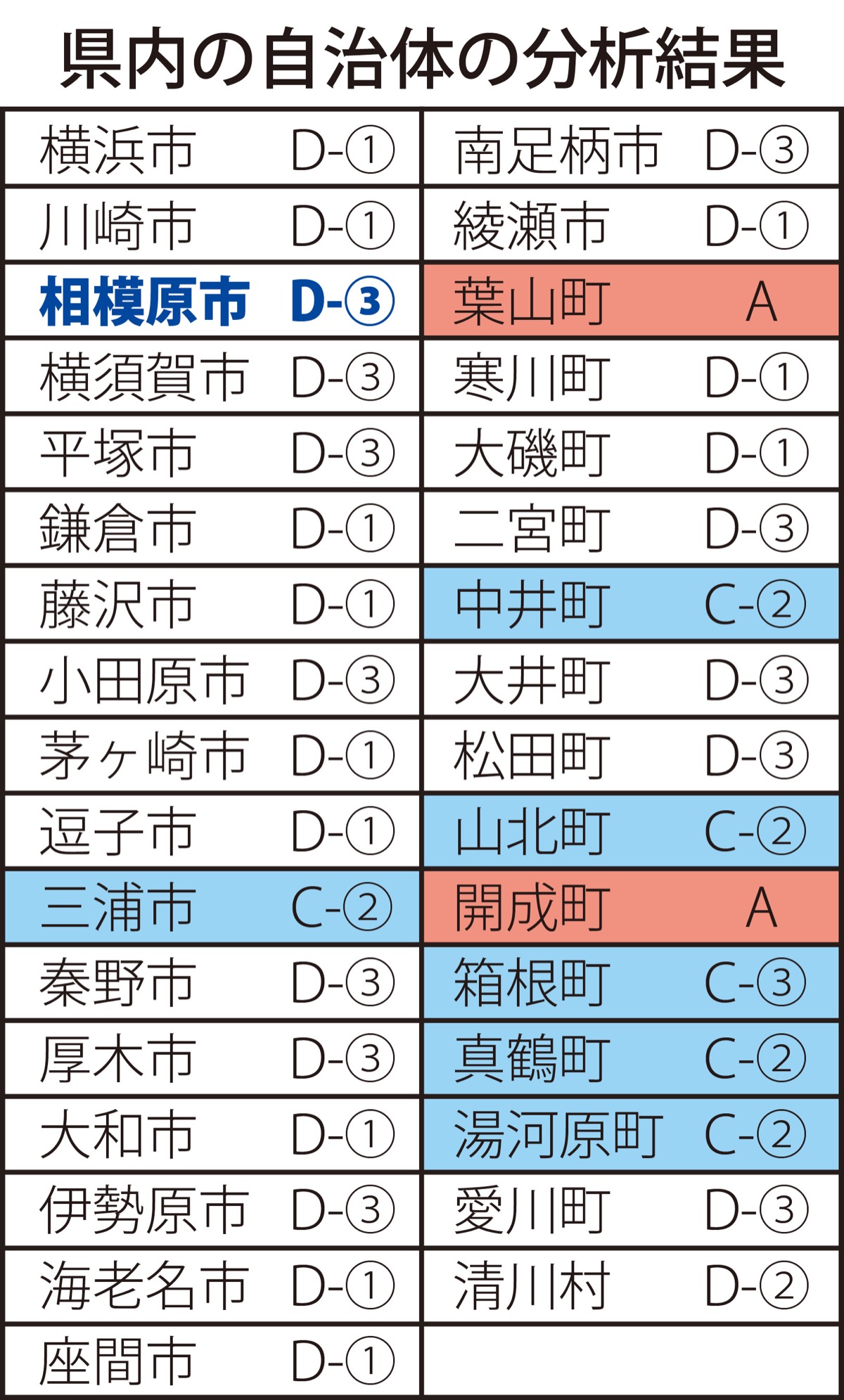 政令市の横浜市と川崎市とも「D-【1】自然減対策が必要」に分類。相模原市と同じ「D-【3】」には横須賀市や平塚市、小田原市、秦野市など7市4町が分類された。