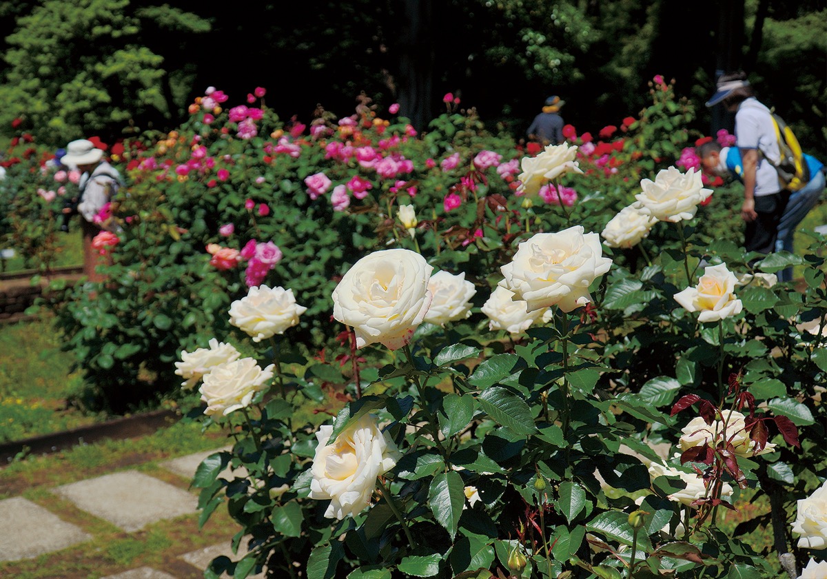 同園には「結愛」「ゴールドバニー」「正雪」「ブルームーン」「ロイヤルプリンセス」など85品種1900株が植えられ、赤や白、黄色、紫など色の違いも楽しめる。職員とボランティアが長年にわたり育成・管理を手掛けてきた。