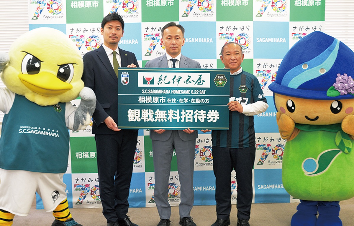 5月15日に市役所で行われた招待券の贈呈式には、本村賢太郎市長、SC相模原の西谷義久社長らが出席した。