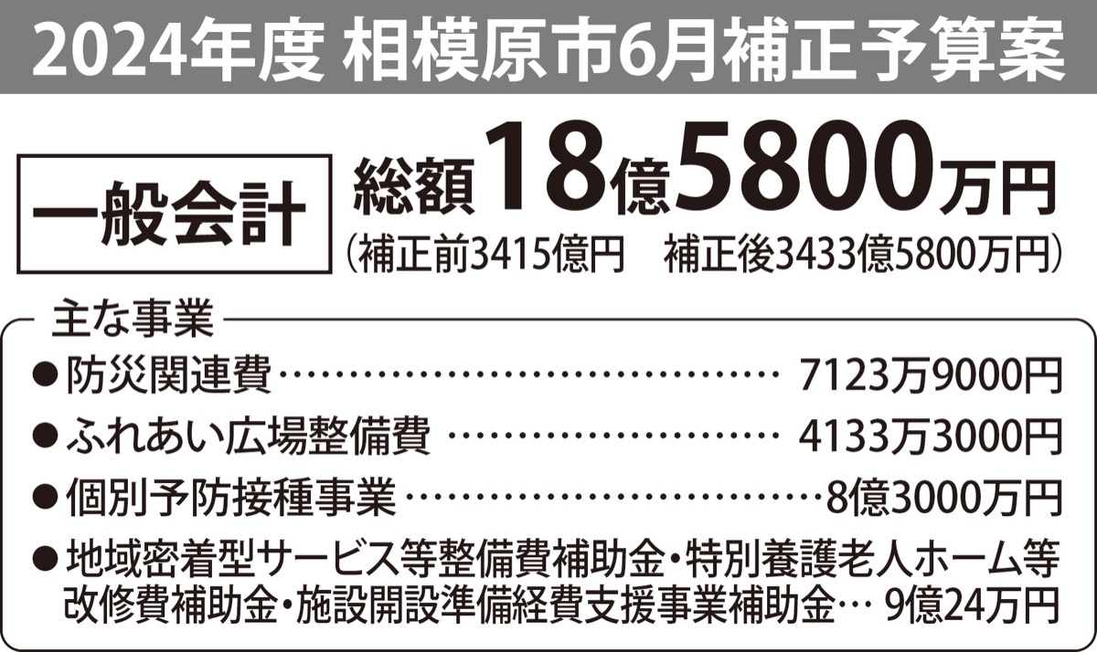 このほか、相模大野ふれあい広場の返還に向けた整備費4133万円、コロナワクチン予防接種事業に関する経費8億3000万円、特別養護老人ホームなどの改修・ICT導入などにかかる補助金活用費9億24万円が含まれている。