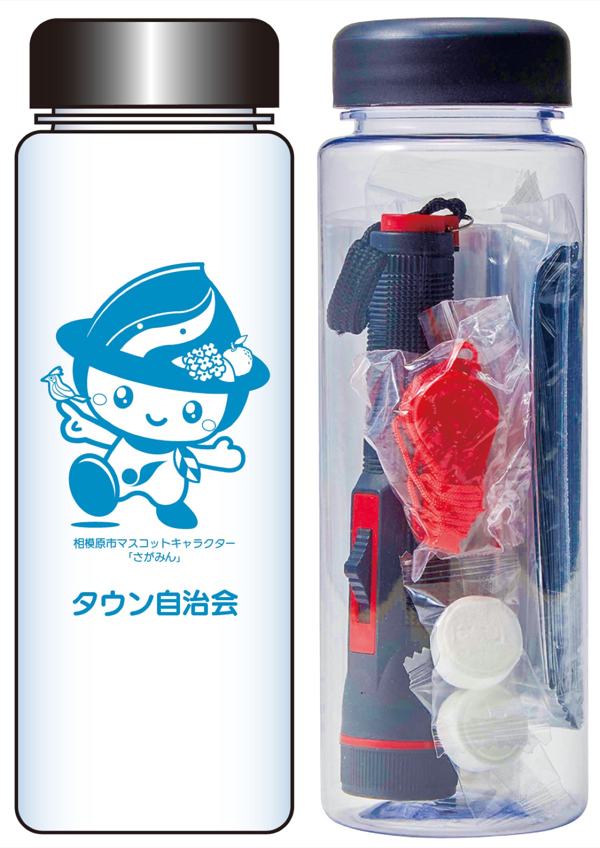 「警視庁警備部災害対策課」が公式SNSで投稿して以降、話題の防災ボトル。タウンニュース社では、この防災ボトルに相模原市マスコットキャラクター・さがみんのイラストと希望する団体名を印刷するオリジナル品の取り扱いを始めた。