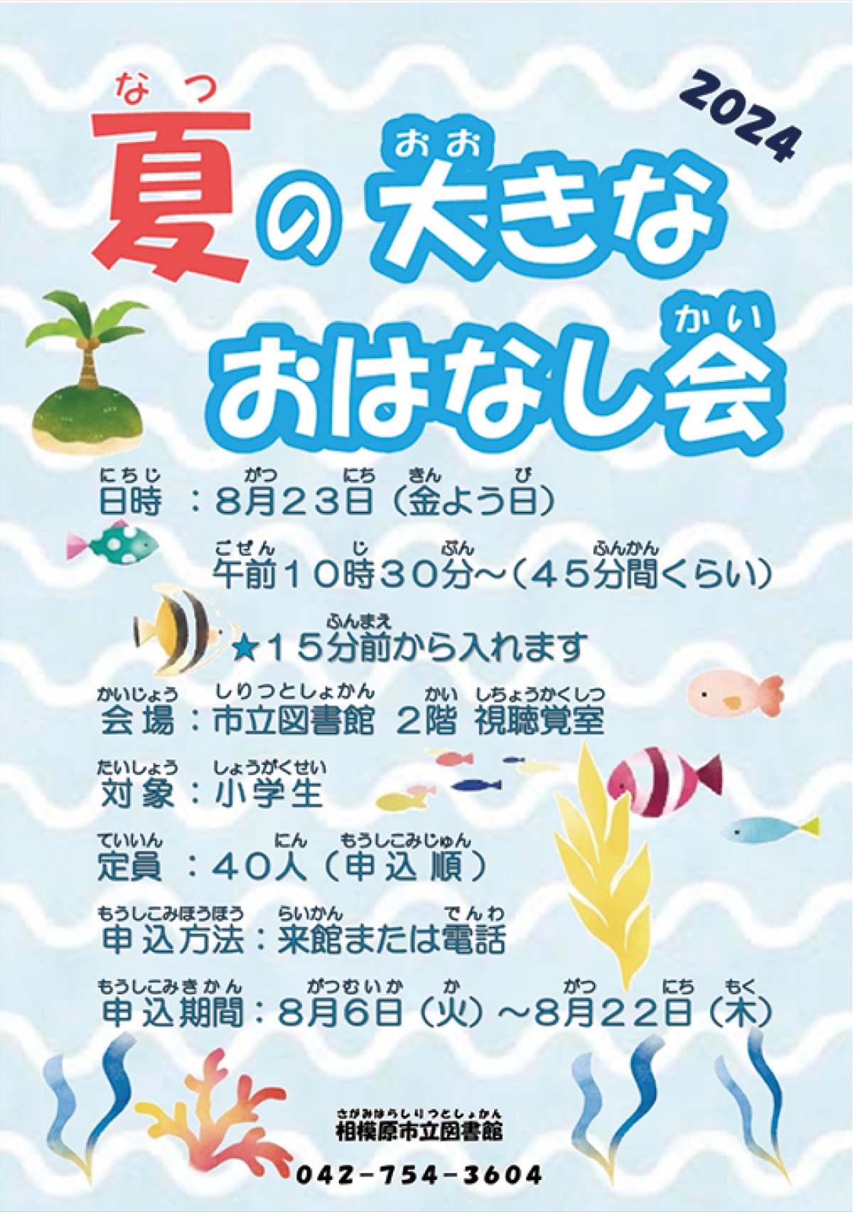 大型紙芝居などが楽しめる「夏の大きなおはなし会」が8月23日(金)、相模原市立図書館で開催される。午前10時30分〜11時15分。会場は2階視聴覚室。対象は小学生とその保護者。