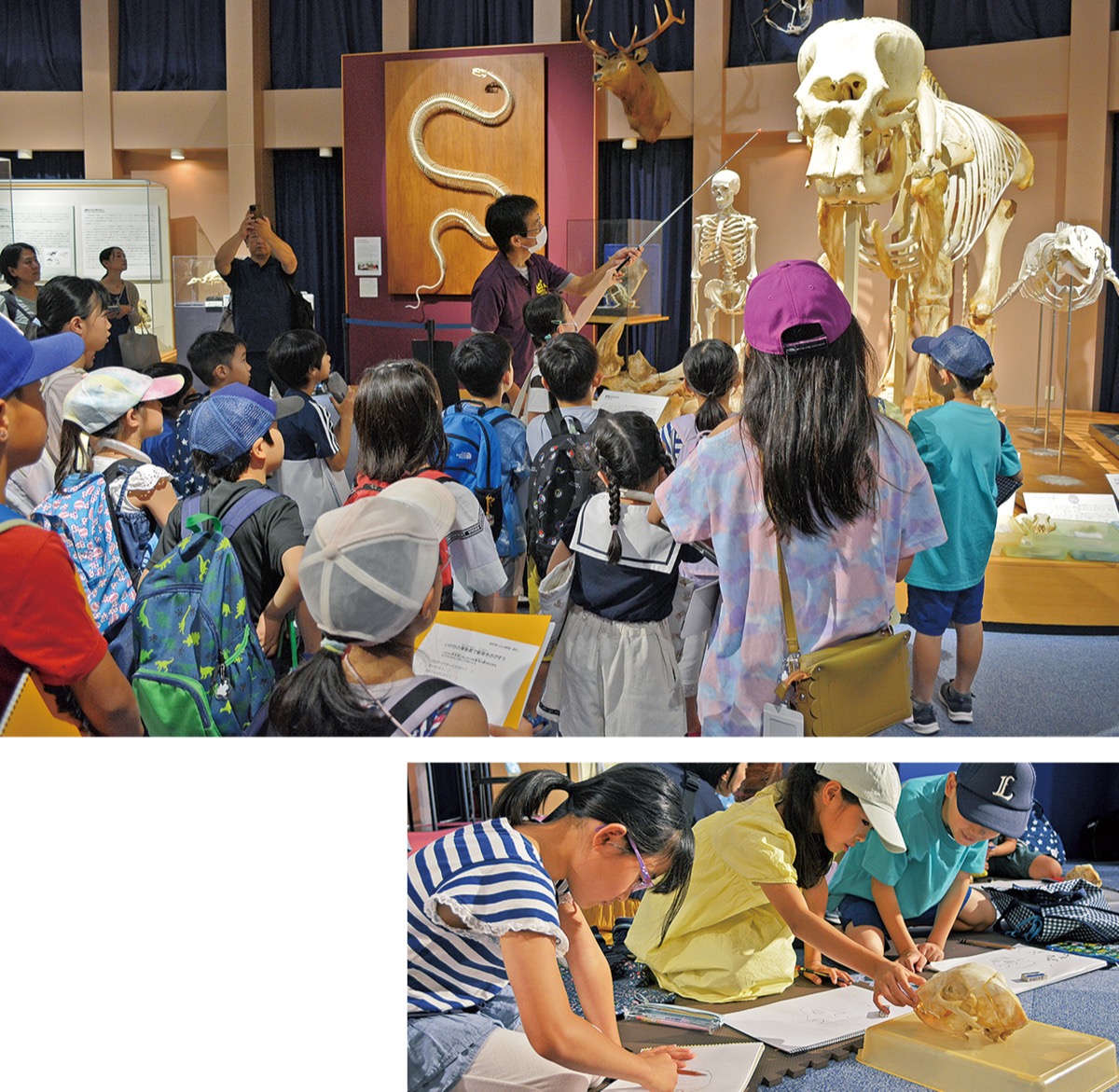 その後、子どもたちはチーターの頭の骨をスケッチ。本物の骨に触れながら細部まで観察し思い思いの1枚を描き上げた。細かい部分まで観察する過程で、骨に神経や血管が通る穴が開いていることに気付く児童もいるなど、本物に触れることができるからこその発見もあり、有意義な夏休みの一日を過ごしていた。村上館長は「子どもたちの輝く目が印象的だった。こうした体験・経験をきっかけに好奇心が育ってもらえたら」と話した。