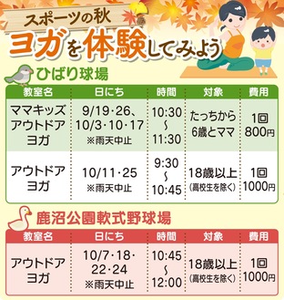 もうすぐ、爽やかな風が心地良い秋の到来。自然の中で気軽に「ヨガ」を体験できる講座が9月19日(木)から淵野辺公園のひばり球場(弥栄3の1の6)や、鹿沼公園の軟式野球場(鹿沼台2の15の1)で開催される。※左イラスト参照。