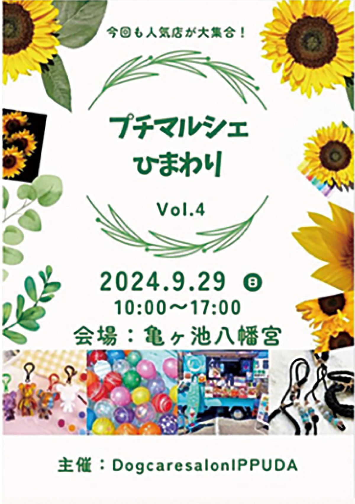 主催は「ドッグケアサロンいっぷだ」。イベントの詳細はインスタグラム「プチマルシェひまわり」で検索。
