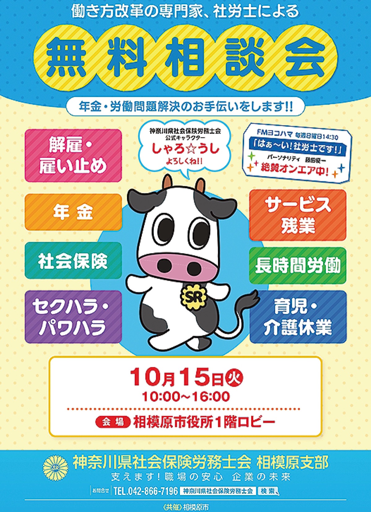 神奈川県社会保険労務士会相模原支部は10月15日(火)、年金や労働問題に関する無料相談会を開催する。午前10時から午後4時まで。会場は相模原市役所1階ロビー。